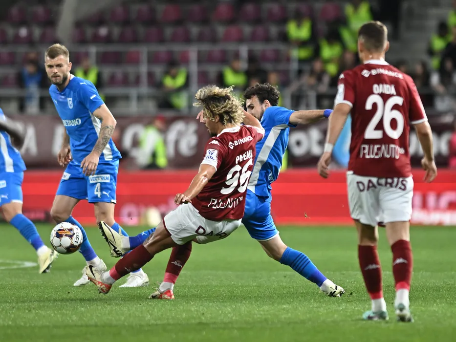 Alexandru Crețu, Jayson Jordan Julien Romain Papeau si Anzor Mekvabishvili in meciul de fotbal dintre Rapid Bucuresti si Universitatea Craiova, din cadrul Play off-ului Superligii Superbet, desfasurat pe Superbet Arena-Giulesti din Bucuresti, luni 29 aprilie 2024. © FOTO:Razvan Pasarica/SPORT PICTURES