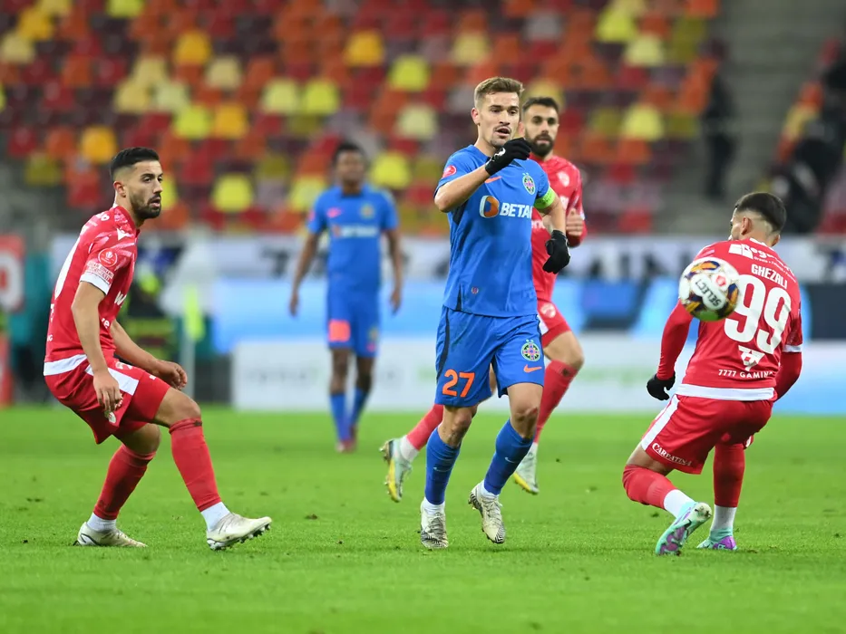 Daniel Gago Iglesias,Darius Dumitru Olaru si Lamine Ghezali in meciul de fotbal dintre Dinamo Bucuresti si FCSB, din cadrul Superligii Superbet, desfasurat pe Arena Nationala din Bucuresti, duminica 26 noiembrie 2023. © FOTO:Razvan Pasarica/SPORT PICTURES