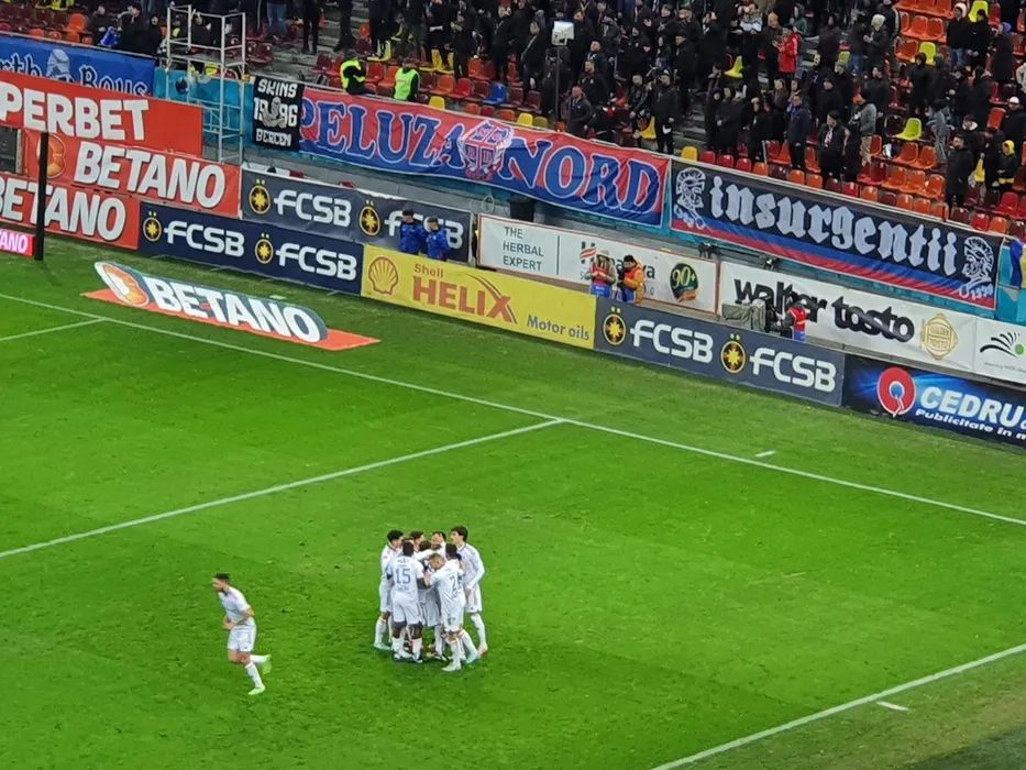Fază controversată în minutul 8 din FCSB – Oțelul: nimeni nu a știut dacă arbitrul Bîrsan a dictat fault sau a validat golul până când VAR-ul a intrat și a luat decizia finală!
