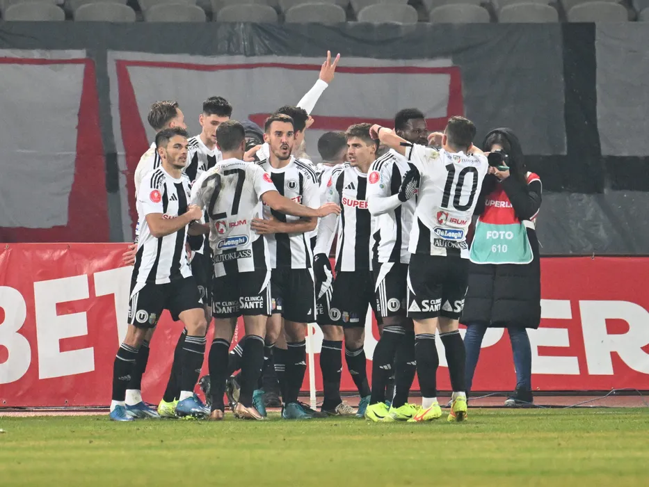 Bucurie a fotbalistilor universitari clujeni Gabriel Dorinel Oancea, Vladislav Blanuta, Razvan Constantin Oaida, Gabriel Bogdan Simion si Mamadou Thiam dupa un gol marcat în meciul de fotbal dintre Universitatea Cluj si CFR Cluj, contând pentru Superliga Superbet, desfășurat pe Cluj Arena din Cluj Napoca, luni 9 decembrie 2024. © FOTO:Răzvan Pasarica/SPORT PICTURES