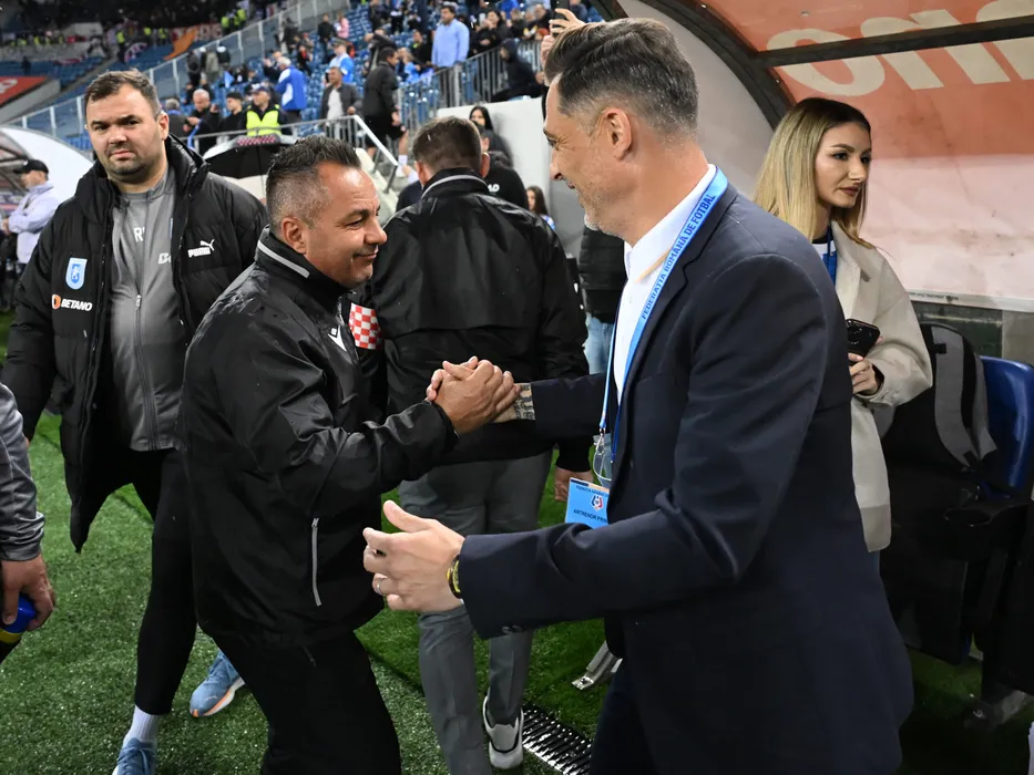Florentin Petre si Mirel Matei Radoi se saluta inaintea meciului dintre Universitatea Craiova si Dinamo Bucuresti, contand pentru Play off-ul Superligii Superbet, desfasurat pe Stadionul Ion Oblemenco din Craiova, sambata 24 mai 2025. © FOTO:Razvan Pasarica/SPORT PICTURES
