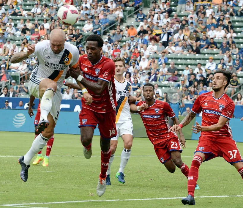 The Galaxy's Jelle Van Damme (left) can not reach a header during the second half Sunday as FC Dallas' Atiba Harris defends. The LA Galaxy and FC Dallas play to a 0-0 tie in the regular season final for both teams Sunday October 23, 2016. Both teams advance to the MLS playoffs with the Galaxy hosting Real Salt Lake next weekend in Carson. (Will Lester-SCNG/Inland Valley Daily Bulletin)