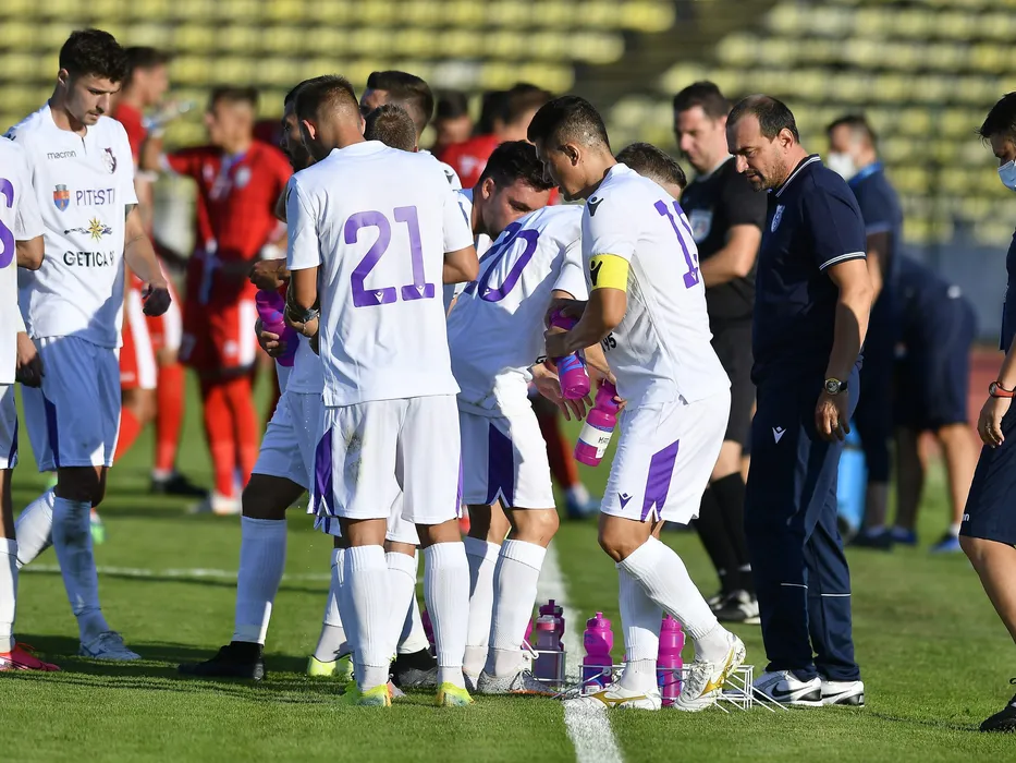 Fotbalistii pitesteni in frunte cu Andrei Prepelita alaturi de antrenorul lor Ionut Badea la o pauza de hidratare in meciul de fotbal dintre FC Arges si FC Botosani, contand pentru Liga 1 Casa Pariurilor, desfasurat pe Stadionul Nicolae Dobrin din Pitesti, vineri 21 august 2020. © FOTO:Razvan Pasarica/SPORT PICTURES