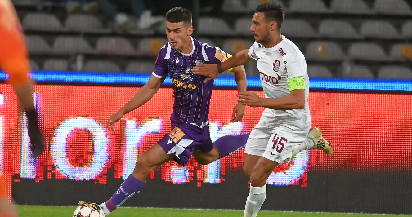 Costinel Andrei Tofan si Mario Camora in meciul de fotbal dintre FC Arges si CFR Cluj, contand pentru Superliga Superbet, desfasurat pe Stadionul Nicolae Dobrin din Pitesti, luni 19 septembrie 2022. © FOTO:Razvan Pasarica/SPORT PICTURES