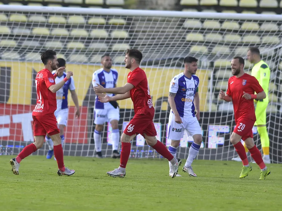 Bucurie a fotbalistilor targovisteni dupa un gol marcat cu Daniel Constantin Florea, Paul Alexandru Iacob si Cristian Daniel Negut in meciul de fotbal dintre FC Arges si Chindia Targoviste, contand pentru Play-out-ul Ligii 1 Casa Pariurilor, desfasurat fara spectatori pe Stadionul Nicolae Dobrin din Pitesti, miercuri 21 aprilie 2021. © FOTO:Razvan Pasarica/SPORT PICTURES