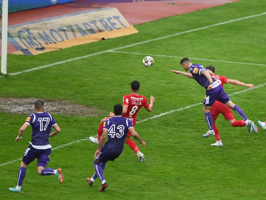 Grigore Ioan Turda marcheaza un gol in meciul de fotbal dintre FC Arges si Chindia Targoviste, contand pentru Play-out-ul Superligii Superbet, desfasurat pe Stadionul Nicolae Dobrin din Pitesti, luni 17 aprilie 2023. © FOTO:Razvan Pasarica/SPORT PICTURES