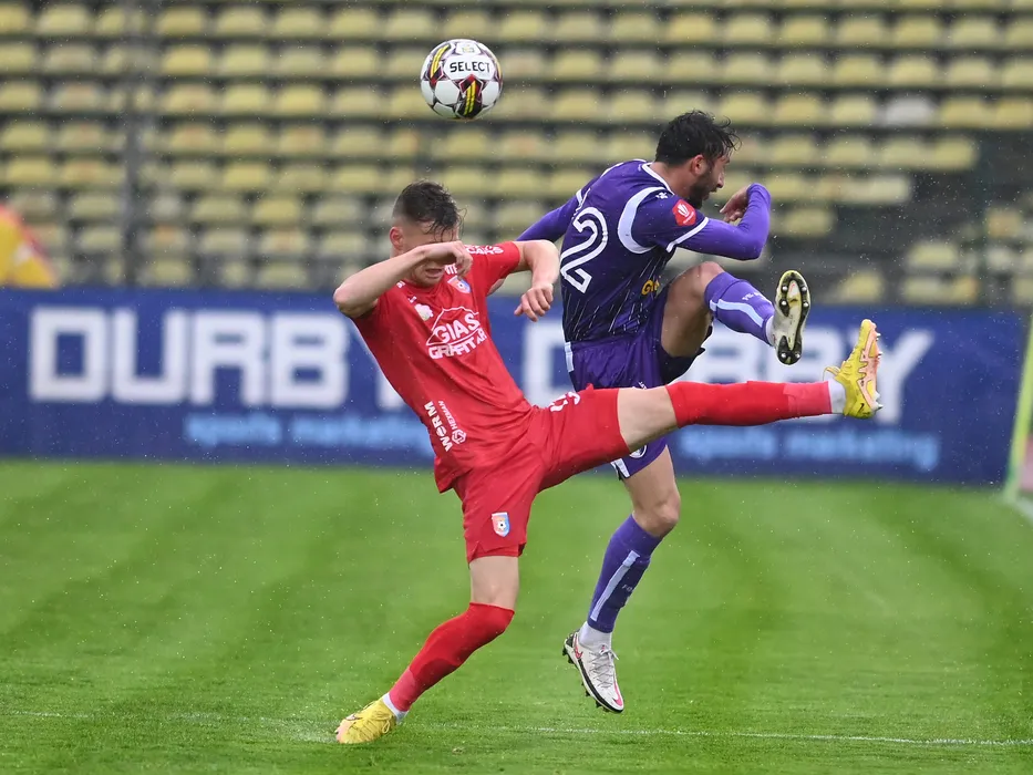 Cosmin Gabriel Atanase si Facundo Emanuel Rizzi in meciul de fotbal dintre FC Arges si Chindia Targoviste, contand pentru Play-out-ul Superligii Superbet, desfasurat pe Stadionul Nicolae Dobrin din Pitesti, luni 17 aprilie 2023. © FOTO:Razvan Pasarica/SPORT PICTURES