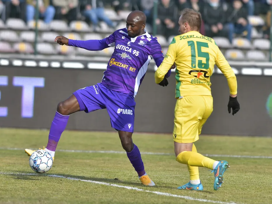 Kehinde Feyi Fatai si Manuel Adrian Scarlatache in meciul de fotbal dintre FC Arges si CS Mioveni, contand pentru Liga 1 Casa Pariurilor, desfasurat pe Stadionul Nicolae Dobrin din Pitesti, duminica 13 februarie 2022. © FOTO:Razvan Pasarica/SPORT PICTURES