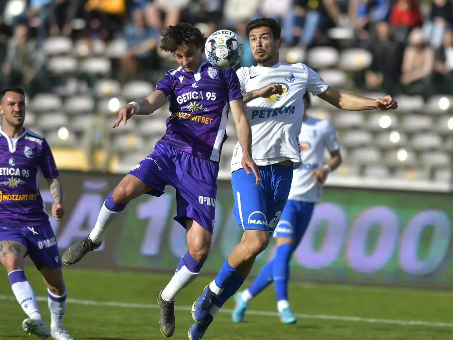 Martin Raynov si Gabriel Cristian Iancu in meciul de fotbal dintre FC Arges si Farul Constanta, contand pentru Play-off-ul Ligii 1 Casa Pariurilor, desfasurat pe Stadionul Nicolae Dobrin din Pitesti, sambata 9 aprilie 2022. © FOTO:Razvan Pasarica/SPORT PICTURES