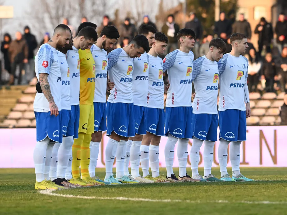 Fotbalistii constanteni tin un minut de reculegere inaintea meciului de fotbal dintre FC Arges si Farul Constanta, contand pentru Superliga Superbet, desfasurat pe Stadionul Nicolae Dobrin din Pitesti, duminica 12 februarie 2023. © FOTO:Razvan Pasarica/SPORT PICTURES