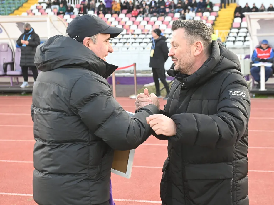 Daniel Stanciu (in dreapta) il saluta pe Gheorghe Hagi inaintea meciului de fotbal dintre FC Arges si Farul Constanta, contand pentru Superliga Superbet, desfasurat pe Stadionul Nicolae Dobrin din Pitesti, duminica 12 februarie 2023. © FOTO:Razvan Pasarica/SPORT PICTURES
