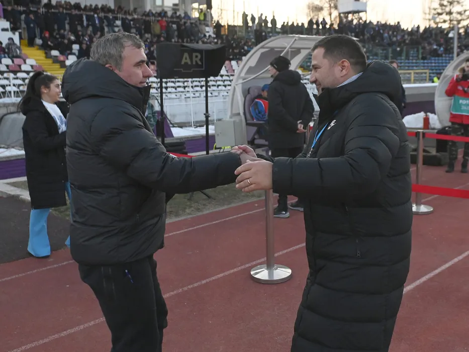 Cei doi antrenori Marius Croitoru si Gheorghe Hagi se saluta inaintea meciului de fotbal dintre FC Arges si Farul Constanta, contand pentru Superliga Superbet, desfasurat pe Stadionul Nicolae Dobrin din Pitesti, duminica 12 februarie 2023. © FOTO:Razvan Pasarica/SPORT PICTURES