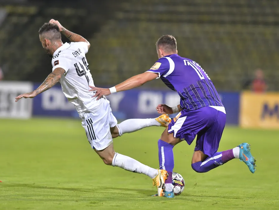 Gabriel Nicolae Enache si Mihai Alexandru Isfan in meciul de fotbal dintre FC Arges si FC U Craiova, contand pentru Superliga Superbet, desfasurat pe Stadionul Nicolae Dobrin din Pitesti, sambata 12 august 2022. © FOTO:Razvan Pasarica/SPORT PICTURES