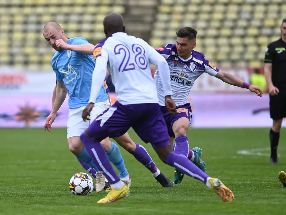 Runar Mar S. Sigurjonsson si Andrias Cristian Calcan in meciul de fotbal dintre FC Arges si FC Voluntari, contand pentru Play-out-ul Superligii Superbet, desfasurat pe Stadionul Nicolae Dobrin din Pitesti, duminica 2 aprilie 2023. © FOTO:Razvan Pasarica/SPORT PICTURES