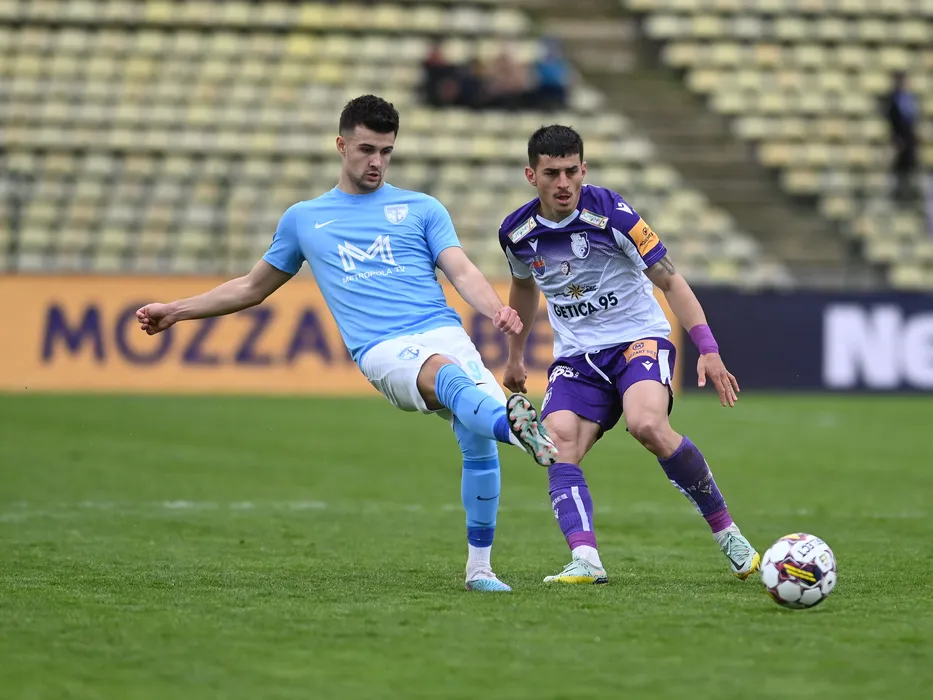 Vitalie Damascan si Costinel Andrei Tofan in meciul de fotbal dintre FC Arges si FC Voluntari, contand pentru Play-out-ul Superligii Superbet, desfasurat pe Stadionul Nicolae Dobrin din Pitesti, duminica 2 aprilie 2023. © FOTO:Razvan Pasarica/SPORT PICTURES