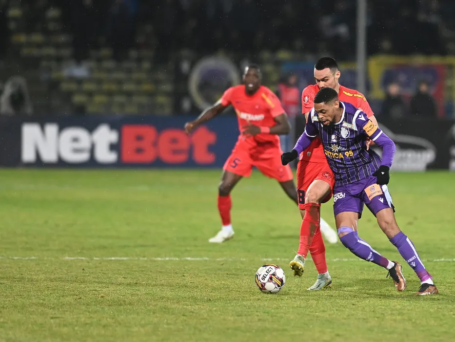 Adrian Gheorghe Sut si Wesley Georges Jobello in meciul de fotbal dintre FC Arges si FCSB, contand pentru Superliga Superbet, desfasurat pe Stadionul Nicolae Dobrin din Pitesti, duminica 26 februarie 2023. © FOTO:Razvan Pasarica/SPORT PICTURES