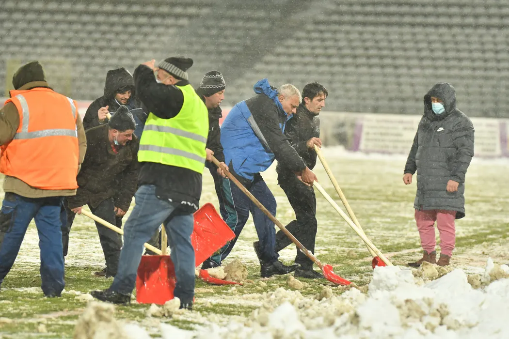 Oameni de ordine dau zapada la meciul de fotbal dintre FC Arges si FCSB, contand pentru Liga 1 Casa Pariurilor, desfasurat fara spectatori pe Stadionul Nicolae Dobrin din Pitesti, marti 26 ianuarie 2021. © FOTO:George Ilinca/SPORT PICTURES