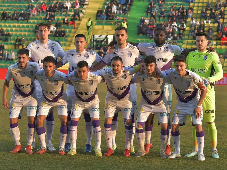 Fotbalistii argeseni la o fotografie de grup realizata inaintea meciului de fotbal dintre FC Arges si CS Gloria Bistrita, contand pentru Cupa Romaniei Betano, desfasurat pe Stadionul Orasenesc din Mioveni, miercuri 4 martie 2026. © FOTO:Mihai Nitoiu/SPORT PICTURES