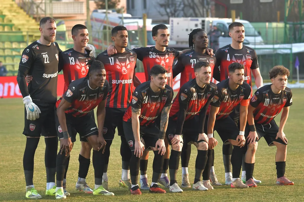 Fotbalistii bistriteni la o fotografie de grup realizata inaintea meciului de fotbal dintre FC Arges si CS Gloria Bistrita, contand pentru Cupa Romaniei Betano, desfasurat pe Stadionul Orasenesc din Mioveni, miercuri 4 martie 2026. © FOTO:Mihai Nitoiu/SPORT PICTURES