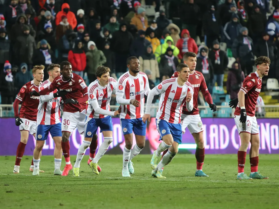 Nikola Stefanovic, Jonathan Cisse, Silva Miguel Angelo Gomes si Sebastian Andrei Borza, Cristian Ignat, David Akpan Ankeye in meciul de fotbal dintre SC Oțelul Galati si FC Rapid 1923 Bucuresti, contand pentru Superliga Superbet, desfasurat pe Stadionul Otelul din Galati, sambata 8 februarie 2025. © FOTO: Valentin Munteanu/SPORT PICTURES