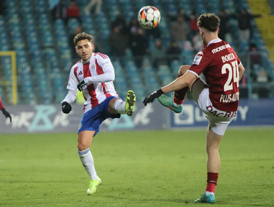 Mustafa Andrei Ahmed Bani si Sebastian Andrei Borza in meciul de fotbal dintre SC Oțelul Galati si FC Rapid 1923 Bucuresti, contand pentru Superliga Superbet, desfasurat pe Stadionul Otelul din Galati, sambata 8 februarie 2025. © FOTO: Valentin Munteanu/SPORT PICTURES