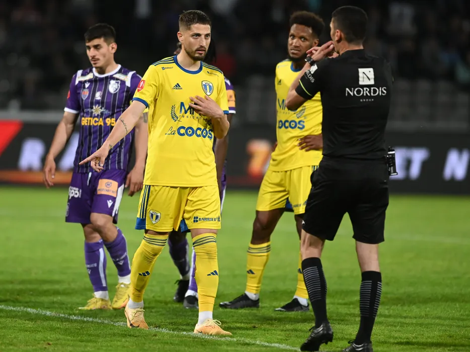 Gheorghe Teodor Grozav discuta cu arbitrul central Marcel Birsan in meciul de fotbal dintre FC Arges si Petrolul Ploiesti, contand pentru Play-out-ul Superligii Superbet, desfasurat pe Stadionul Nicolae Dobrin din Pitesti, vineri 19 mai 2023. © FOTO:Razvan Pasarica/SPORT PICTURES