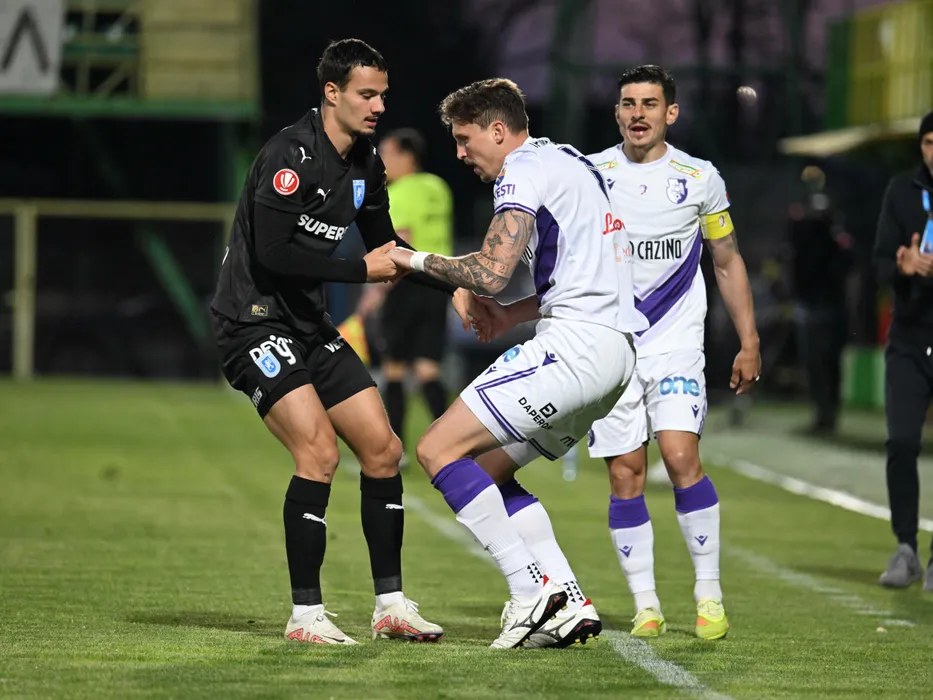 Assad Al Islam Al Hamlawi il ajuta sa se ridice pe Guilherme Garutti Gomes sub privirile lui Costinel Andrei Tofan in meciul de fotbal dintre FC Arges si Universitatea Craiova, contand pentru Play off-ul Superligii Superbet, desfasurat pe Stadionul Orasenesc din Mioveni, luni 27 aprilie 2026. © FOTO:Razvan Pasarica/SPORT PICTURES