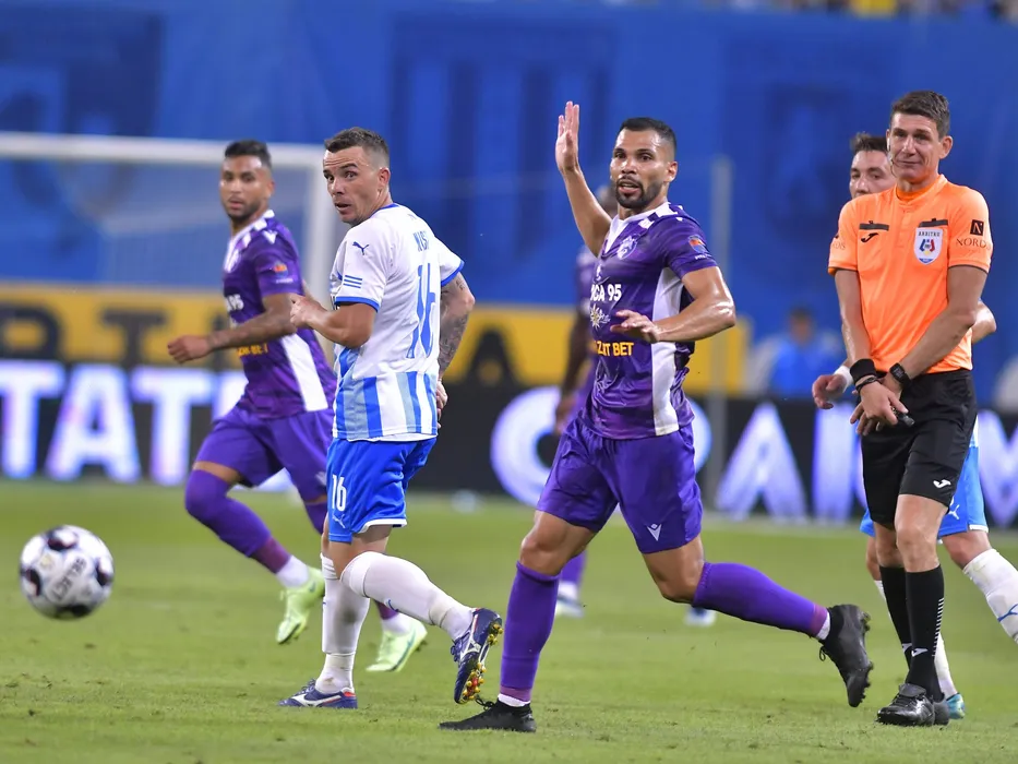 Arbitrul central Horia Mladinovici alaturi de Dan Nicolae Nistor si Cesar Daniel Meza Colli in meciul de fotbal dintre Universitatea Craiova si FC Arges, contand pentru Liga 1 Casa Pariurilor, desfasurat pe Stadionul Ion Oblemenco din Craiova, sambata 17 iulie 2021. © FOTO:Razvan Pasarica/SPORT PICTURES