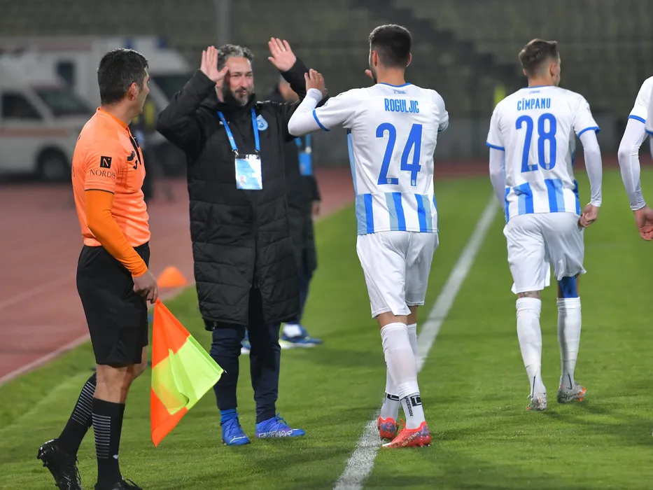 Sebastian Bon il felicita pe Ante Roguljic dupa un gol marcat in meciul de fotbal dintre FC Arges si Universitatea Craiova, contand pentru Liga 1 Casa Pariurilor, desfasurat pe Stadionul Nicolae Dobrin din Pitesti, duminica 21 noiembrie 2021. © FOTO:Razvan Pasarica/SPORT PICTURES