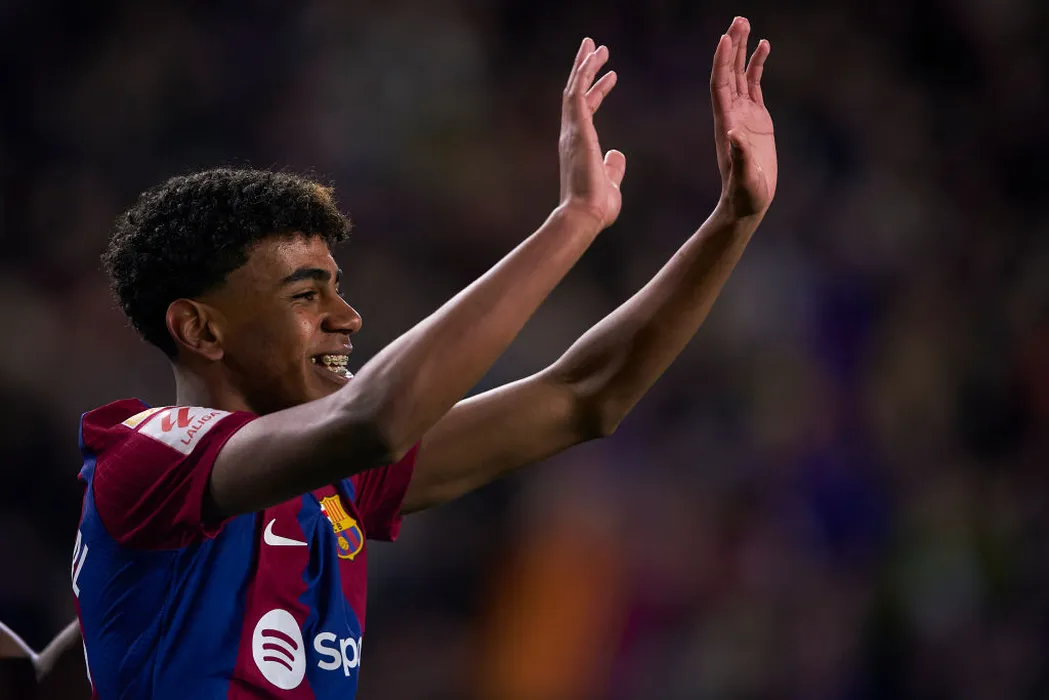 BARCELONA, SPAIN - FEBRUARY 11: Lamine Yamal of FC Barcelona celebrates after scoring his team's first goal during the LaLiga EA Sports match between FC Barcelona and Granada CF at Estadi Olimpic Lluis Companys on February 11, 2024 in Barcelona, Spain. (Photo by Pedro Salado/Getty Images)
