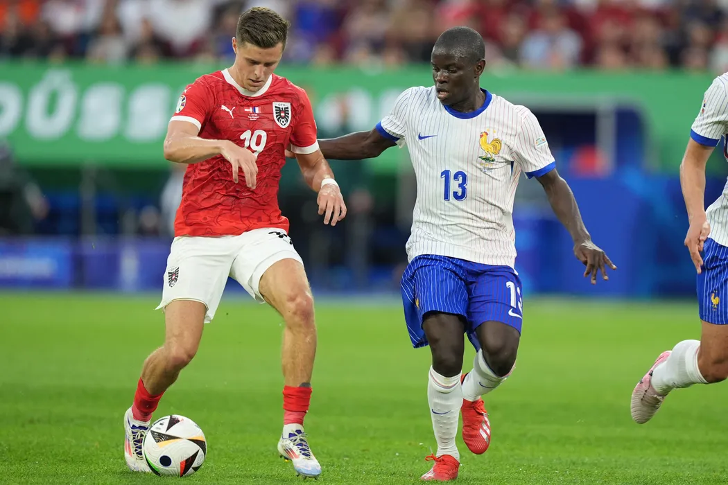 DUSSELDORF, GERMANY - JUNE 17: N'Golo Kante (13) of France in action against Christoph Baumgartner(11) of Austria during the 2024 European Football Championship (EURO 2024) Group D football match between France and Austria at Merkur Spiel-Arena in Dusseldorf, Germany on June 17, 2024. Emin Sansar / Anadolu/ABACAPRESS.COM
