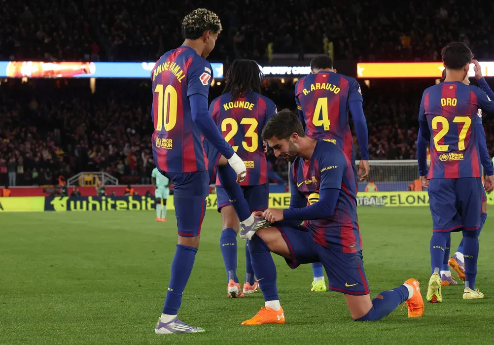 Barcelona's Spanish forward #07 Ferran Torres celebrates with Spain's forward #19 Lamine Yamal (L) scoring his team's fourth goal during the Spanish league football match between FC Barcelona and Athletic Club Bilbao at Camp Nou Stadium in Barcelona on November 22, 2025.,Image: 1053967555, License: Rights-managed, Restrictions: , Model Release: no, Credit line: Lluis GENE / AFP / Profimedia