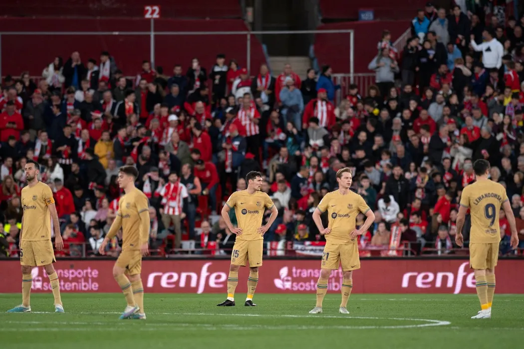 Barcelona's players react during the Spanish League football match between UD Almeria and FC Barcelona at the Municipal Stadium of the Mediterranean Games in Almeria, on February 26, 2023.,Image: 758844826, License: Rights-managed, Restrictions: , Model Release: no