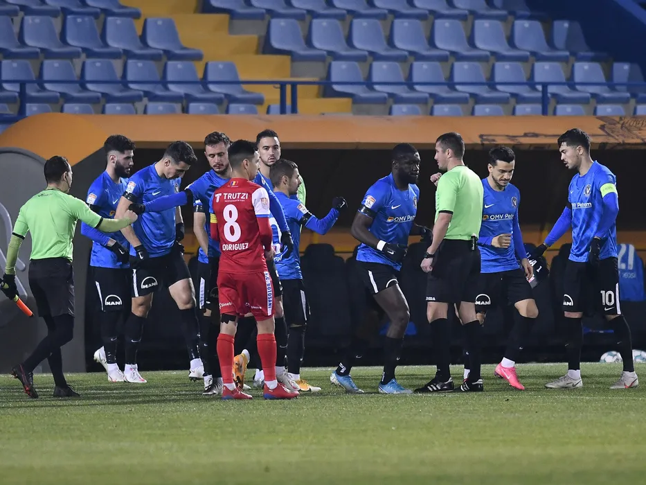 Fotbalistii Viitorului intra pe teren salutanarbitrul central Adrian Viorel Cojocaru in meciul de fotbal dintre FC Viitorul Constanta si FC Botosani, contand pentru Liga 1 Casa Pariurilor, desfasurat fara spectatori pe Stadionul Central al Academiei Gheorghe Hagi din Ovidiu, marti 15 decembrie 2020. © FOTO:Razvan Pasarica/SPORT PICTURES
