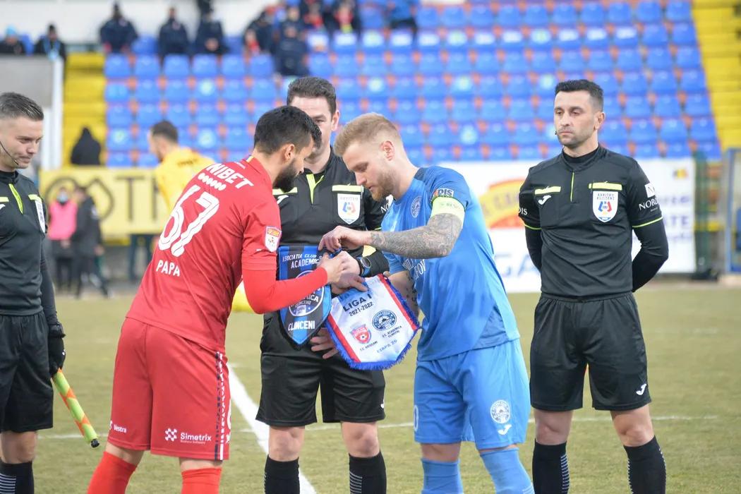 Arbitrul central Andrei Antonie, Enriko Papa si Marcel Holzmann in meciul de fotbal dintre FC Botosani si Academica Clinceni, contand pentru Liga 1 Casa Pariurilor, desfasurat pe Stadionul Municipal din Botosani, luni 14 februarie 2022. © FOTO:Ionut Tabultoc/SPORT PICTURES