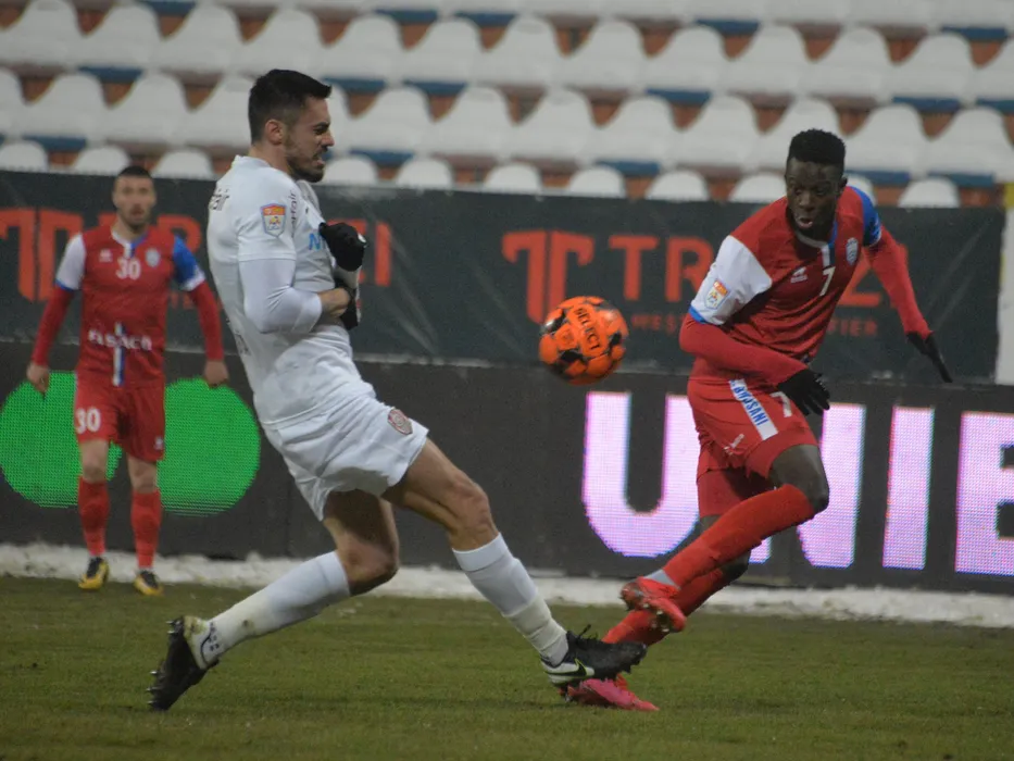 Andrei Andonie Burca si Hamidou Keyta in meciul de fotbal dintre FC Botosani si CFR Cluj, contand pentru Liga 1 Casa Pariurilor, desfasurat fara spectatori pe Stadionul Municipal din Botosani, luni 8 februarie 2021. © FOTO:Ionut Tabultoc/SPORT PICTURES