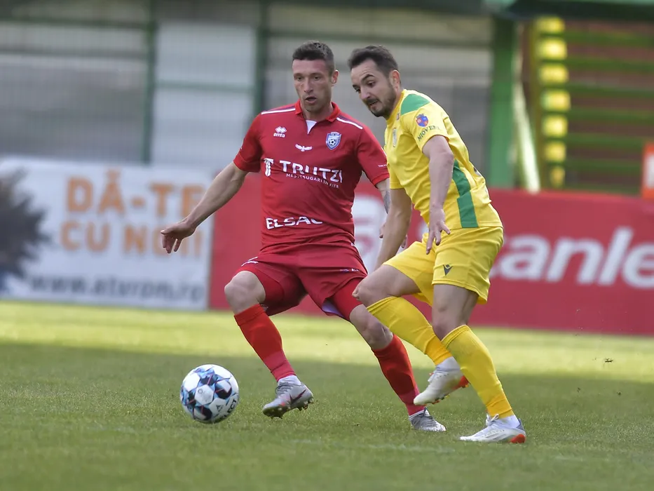 Alexandru Tiganasu si Laurentiu Ionut Radescu in meciul de fotbal dintre CS Mioveni si FC Botosani, contand pentru Play-out-ul Ligii 1 Casa Pariurilor, desfasurat pe Stadionul Orasenesc din Mioveni, luni 2 mai 2022. © FOTO:Razvan Pasarica/SPORT PICTURES