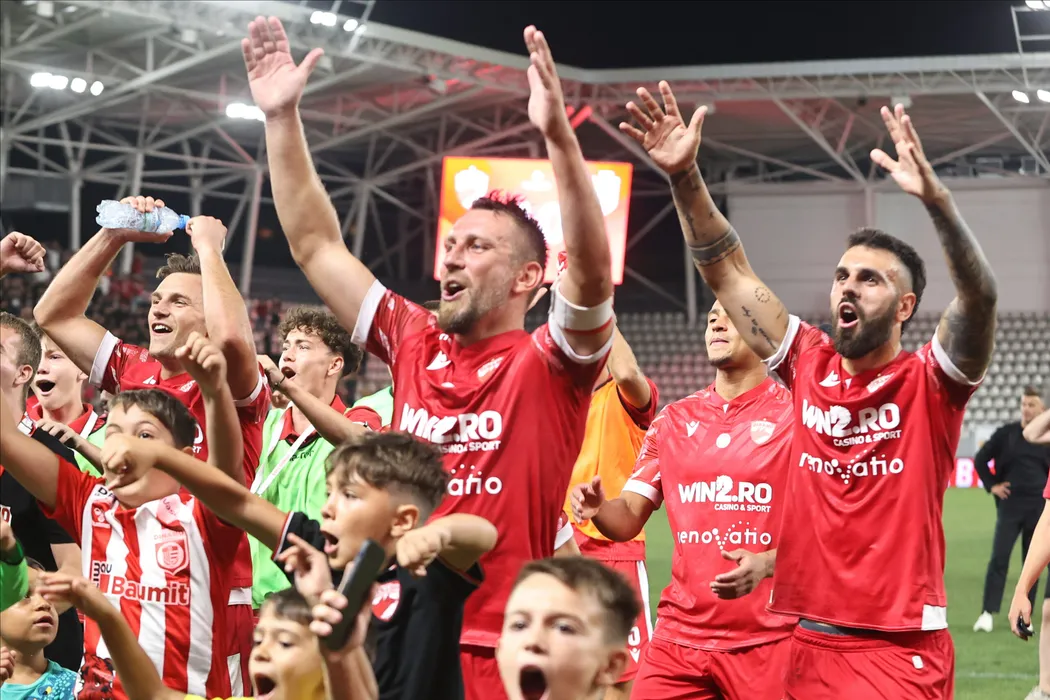 Fotbalistii dinamovisti Dennis Dorin Politic si Razvan Bogdan Patriche Nichita saluta galeria dupa meciul de fotbal dintre Dinamo Bucuresti si FC Botosani, din cadrul Superligii Superbet, desfasurat pe Stadionul National Arcul de Triumf din Bucuresti, luni 14 august 2023. © FOTO:Gheorghe Fluster/SPORT PICTURES