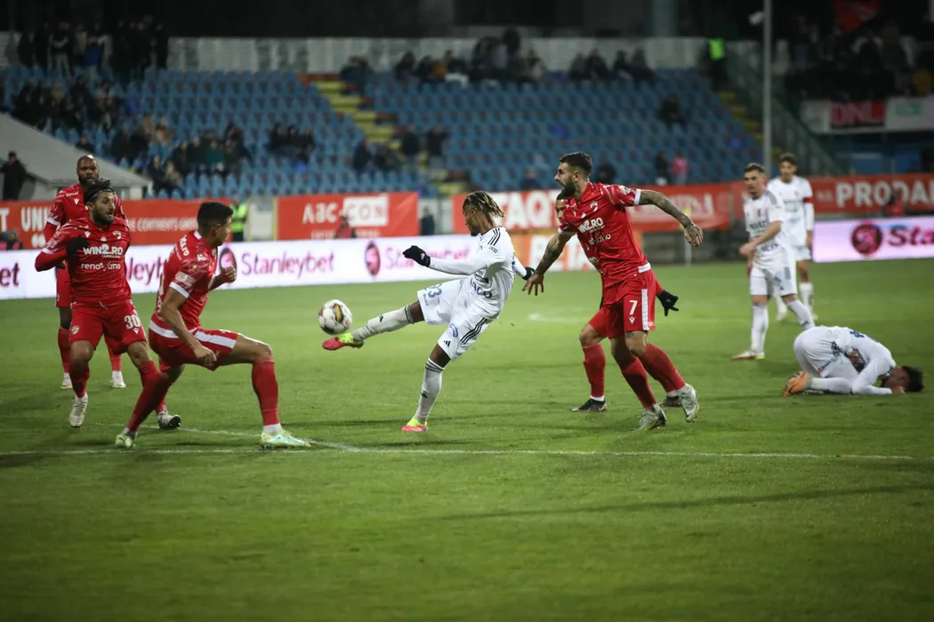 Virgile Jacky Marcel Pinson și Goncalo De Almeida Gregorio în meciul de fotbal dintre AFC Botosani și SC Dinamo 1948 SA, contând pentru SUPERLIGA SUPERBET, desfășurat pe Stadionul Municipal din Botoșani, luni 18 decembrie 2023. © FOTO: Ionuț TABULTOC/SPORT PICTURES