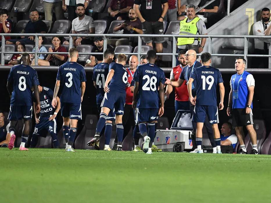 Leo Grozavu reacționează alături de Nicolae Rosca si fotbalistii botoseneni in meciul de fotbal dintre Rapid Bucuresti si FC Botosani, din cadrul Superligii Superbet, desfasurat pe Superbet Arena-Giulesti din Bucuresti, luni 4 august 2025. © FOTO:Razvan Pasarica/SPORT PICTURES