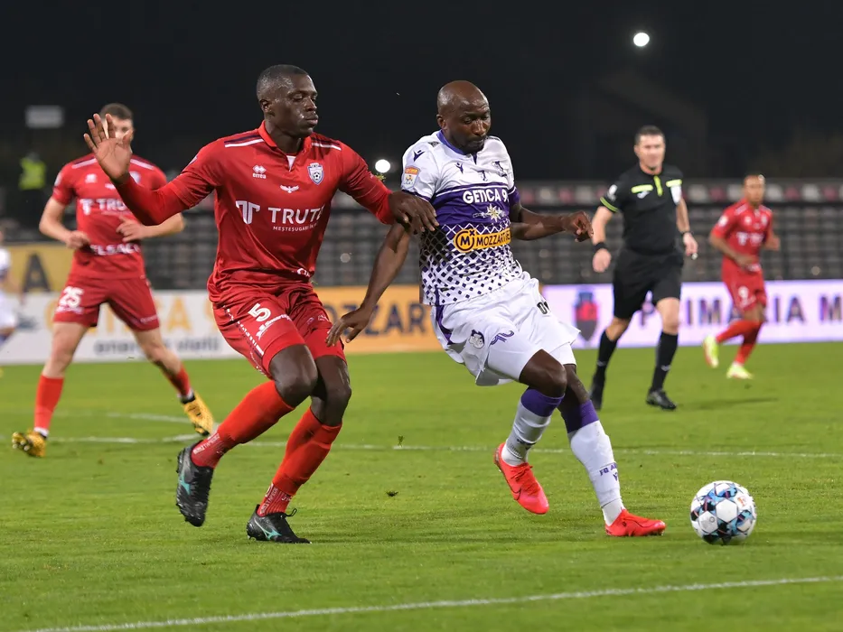 Joyskim Aurelien Dawa Tchakonte si Kehinde Feyi Fatai in meciul de fotbal dintre FC Arges si FC Botosani, contand pentru Liga 1 Casa Pariurilor, desfasurat pe Stadionul Nicolae Dobrin din Pitesti, vineri 5 noiembrie 2021. © FOTO:Razvan Pasarica/SPORT PICTURES