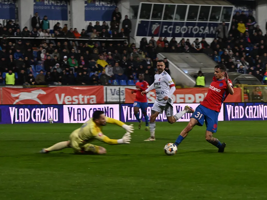 Luka Kukic il faulteaza in careu pe Juri Cisotti sub privirile lui Andrei George Miron in meciul dintre FC Botosani si FCSB, contand pentru Play out-ul Superligii Superbet, desfasurat pe Stadionul Municipal din Botosani, vineri 3 aprilie 2026. © FOTO:Razvan Pasarica/SPORT PICTURES