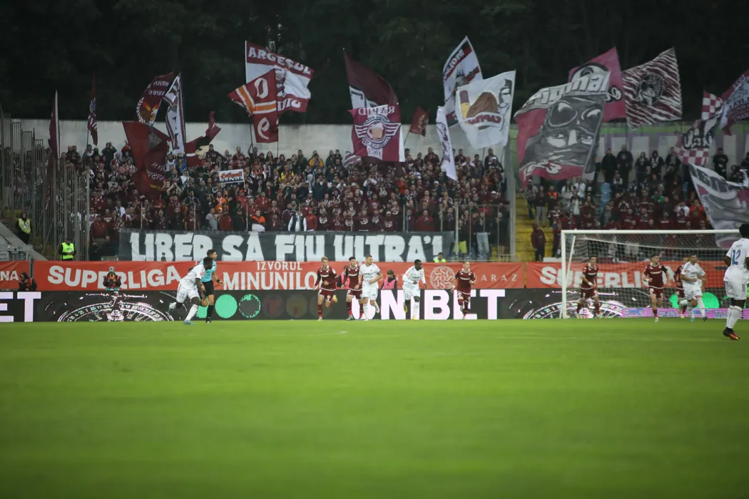 Galeria giuleșteană cu steaguri și fulare își încurajează favoriții în meciul de fotbal dintre FC Botoșani și PFC Rapid 1923 București, contând pentru Superliga Superbet, desfășurat pe Stadionul Municipal din Botoșani, duminică 6 octombrie 2024. © FOTO: Ionuț TABULTOC/SPORT PICTURES