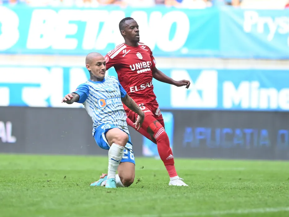 Ionut Alexandru Mitrita marcheaza un gol de langa Charles Petro in meciul de fotbal dintre Universitatea Craiova si FC Botosani, contand pentru Superliga Superbet, desfasurat pe Stadionul Ion Oblemenco din Craiova, duminica 1 octombrie 2023. © FOTO:Razvan Pasarica/SPORT PICTURES