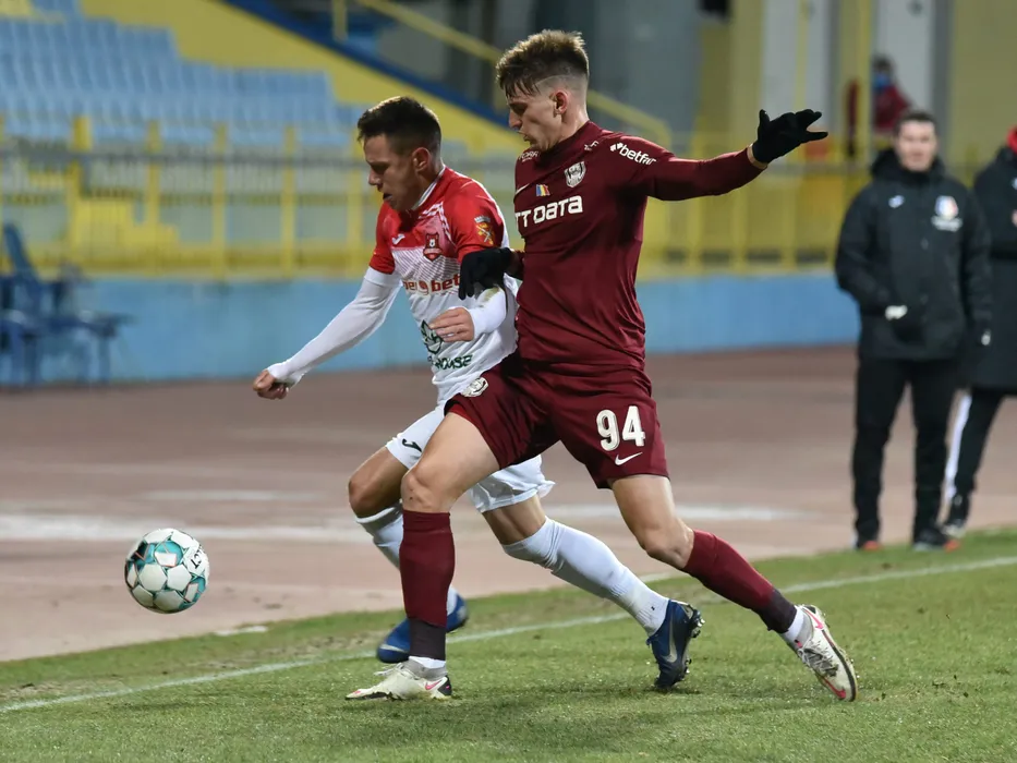 Ionut Petrisor Petrescu si Catalin Mihai Itu in meciul de fotbal dintre FC Hermannstadt si CFR Cluj, contand pentru Liga 1 Casa Pariurilor, desfasurat fara spectatori pe Stadionul Municipal din Medias, luni 25 ianuarie 2021. © FOTO:Alexandru Veres/SPORT PICTURES