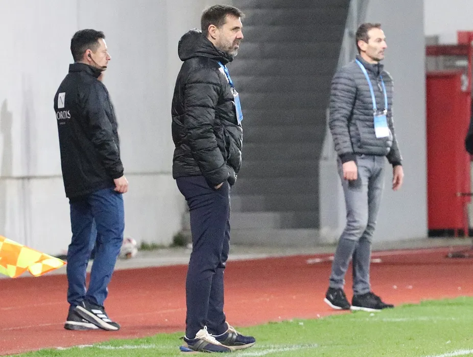 Zeljko Kopic, Marius Măldărașanu și Arbitrul de rezerva Iulian Dima în meciul de fotbal dintre AFC Hermannstadt Sibiu și Dinamo București, contând pentru Superliga Superbet Play-Out, desfășurat pe Stadionul Municipal din Sibiu, duminică 17 martie 2024. © FOTO: Valentin MACREA/SPORT PICTURES