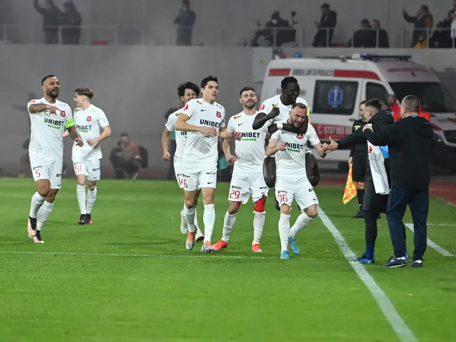 Bucurie a fotbalistilor sibieni dupa un gol marcat cu Florin Bejan, Paul Marius Antoche, Ciprian Ionut Biceanu, Paul Marius Antoche su Silviu Nicolae Balaure in meciul de fotbal dintre FC Hermannstadt si Farul Constanta, contand pentru Superliga Superbet, desfasurat pe Stadionul Municipal din Sibiu, sambata 10 decembrie 2022. © FOTO:Razvan Pasarica/SPORT PICTURES