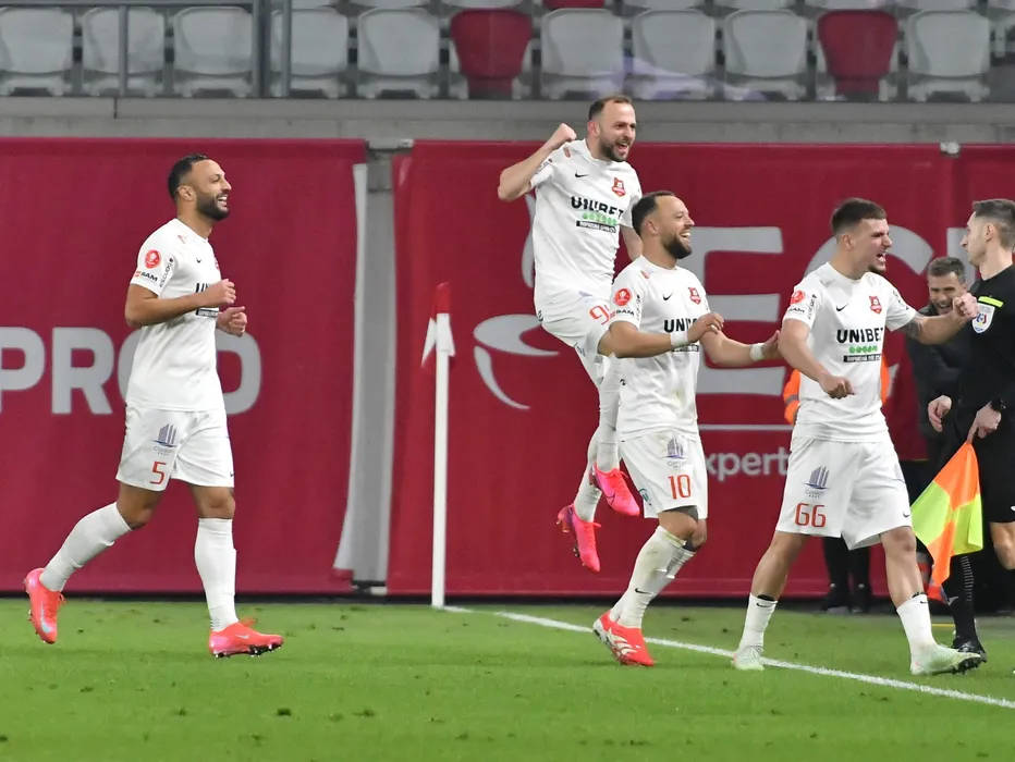 Fotbalistii sibieni Tiberiu Ionut Capusa, Cristian Daniel Negut, Silviu Nicolae Balaure si Florin Bejan se bucura dupa un gol marcat in meciul de fotbal dintre Sepsi OSK Sfantu Gheorghe si AFC Hermannstadt Sibiu, contand pentru SuperLiga Superbet, desfasurat pe Stadionul SEPSI Arena OSK din Sfantu Gheorghe, vineri 14 februarie 2025. © FOTO: Bogdan Balas/SPORT PICTURES