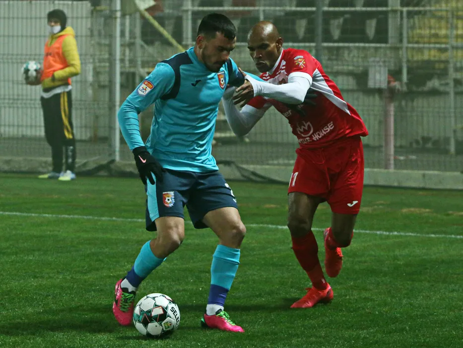 Madalin Martac si Jo Santos in meciul de fotbal dintre Chindia Targoviste si AFC Hermannstadt din 16-imile de finala ale Cupei Romaniei, disputat pe stadionul Marin Anastasovici din Giurgiu, 27 noiembrie 2020. © FOTO:Gheorghe Fluster / Sport Picture