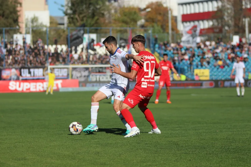 Frederic Ferreira Maciel și Alexandru Daniel Jipa în meciul de fotbal dintre SC OȚELUL GALAȚI si AFC HERMANNSTADT SIBIU, contând pentru Superliga Superbet, desfășurat pe Stadionul Oțelul din Galați, sâmbătă 28 octombrie 2023. © FOTO: Valentin MUNTEANU/SPORT PICTURES